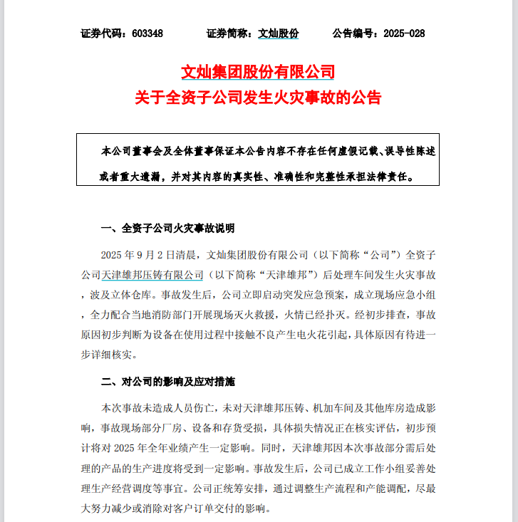 文灿股份表示,本次事故未造成人员伤亡,未对天津雄邦压铸、机加车间及其他库房造成影响,事故现场部分厂房、设备和存货受损,具体损失情况正在核实评估,初步预计将对2025年全年业绩产生一定影响。同时,天津雄邦因本次事故部分需后处理的产品的生产进度将受到一定影响。